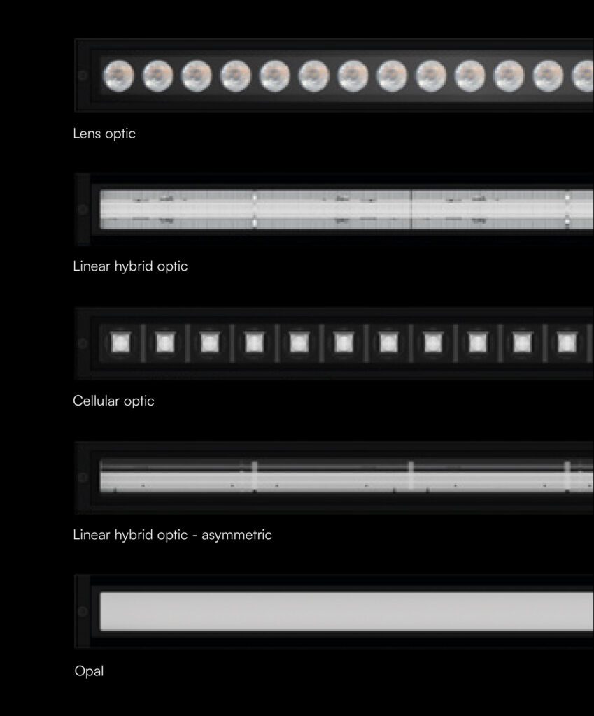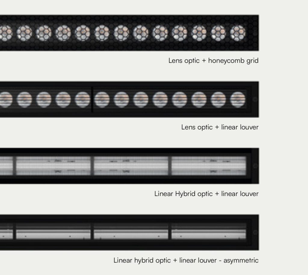 For maximum glare control, Wall Grazing, Flood, and Wall Washer distributions are available with integrated either a linear louver or an honeycomb system.